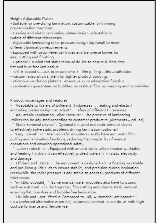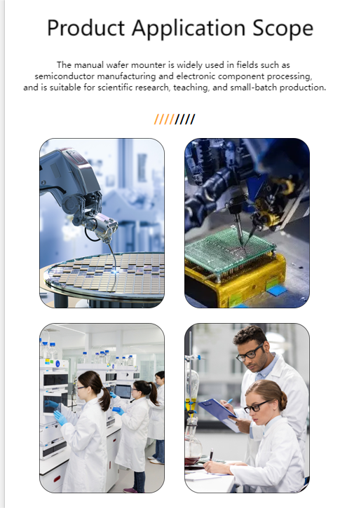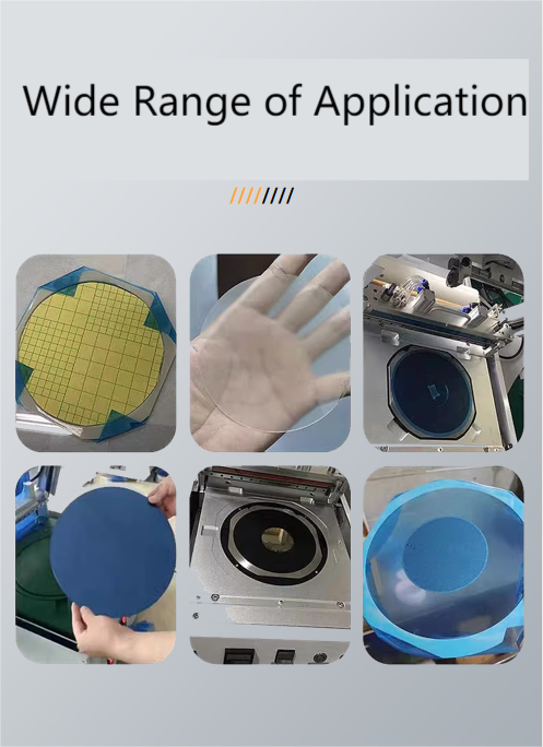 يتم استخدام هذا الجهاز (الآلة) بشكل رئيسي لطلاء فيلم Si wafer BG مقاس 12 بوصة. لا نتوءات، لا فقاعات. نوع الرقاقة هو رقاقة وهمية. إن آلة لصق الفيلم النصف أوتوماتيكية هذه مناسبة لتطبيق الفيلم على منتجات مثل الرقاقات، وأشباه الموصلات، والسيراميك، والزجاج. إنه جهاز يستخدم لمعالجة طلاء الفيلم، مصمم خصيصًا لإلتصاق المواد الرقيقة بدقة على سطح الرقاقات. فهو يجمع بين خصائص التشغيل اليدوي والتحكم الآلي، مما يوفر دقة وكفاءة أعلى في تطبيق الفيلم مع الحفاظ على الراحة التشغيلية.